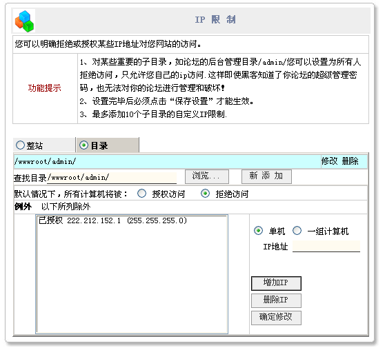 5. 整站設置為只讀(在控制面板中點文件管理),單獨把數據庫文件設置為完全控制權限。 我們的思路:防止木馬上傳-即使上傳了也不能執行-即使有了權限也不能登錄后臺-即使能夠上傳我們也能很容易發現和清除。 通過以上組合設置,輕松打造史上最安全的網站!