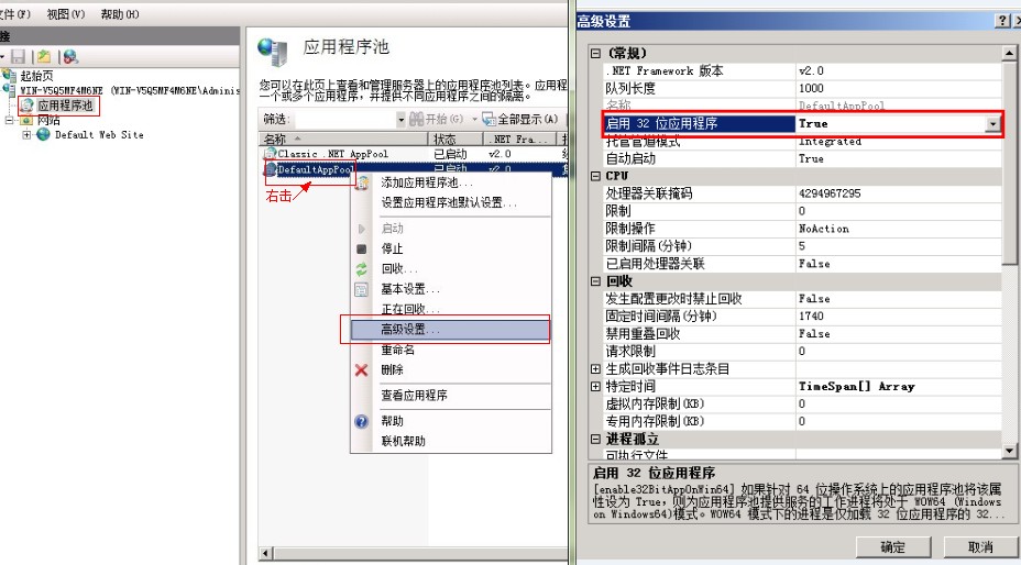 如上圖選中 應用程序池--找到相應的程序池,右擊--高級設置--將‘啟用32位應用程序’ 設置為 True (這個非常重要不然PHP無法正常執行)再訪問正常了。 以上是對IIS里面的所有站點全局設置腳本映射,可對單獨的站點設置設置方法和上面一樣。 2、FTP 設置 FTP數據是保存在注冊表里面的,腳本在win2003系統里面默認會配置好,在WIN2008里面安裝后默認權限是不正確的需要手動設置,在注冊表里面找到 HKEY_LOCAL_MACHINE\SOFTWARE\Wow6432Node\Cat Soft 將Cat Soft及其子目錄設置為servu用戶完全控制即可。