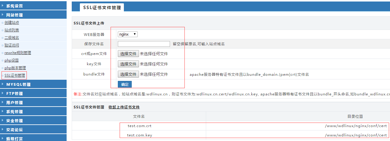 注意: 1、證書文件名必須和站點(diǎn)域名相同才能成功部署https(參考如附圖)