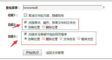 1.虛擬主機: ①如圖在wwwrot文件夾上點“查毒”》按照截圖選擇功能2和3,根據文件量的大小搜索時間不定,人工核實搜索到有問題的文件內容進行處理。 ②通過文件管理,查看最近修改的文件和文件夾內容,是否有被掛馬和非法信息。 2.云主機: ①根據修改時間排序,查看最近修改的文件和文件夾,是否有被加入非法信息; ②確保網站都是使用建站助手或wdcp建立,如用戶手工建立,一定確保權限最小化,下面服務器云主機安全建議有說明。