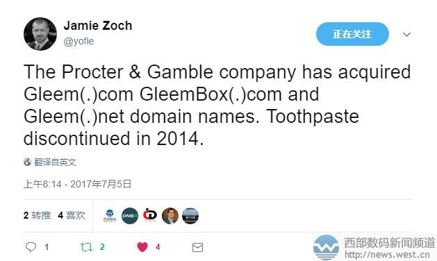 寶潔公司收購整套gleem相關(guān)域名!格利姆牙膏欲重出江湖?三五互聯(lián)(35.com)7月6日消息,據(jù)知名投資人Jamie Zoach曝料稱,全球最大的日用消費品公司——寶潔,近日一舉收購了gleem.com/.net以及gleembox.com三枚域名。有意思的是,gleem.com對應的寶潔旗下牙膏品牌,早在2014年便被寶潔公司放棄了。