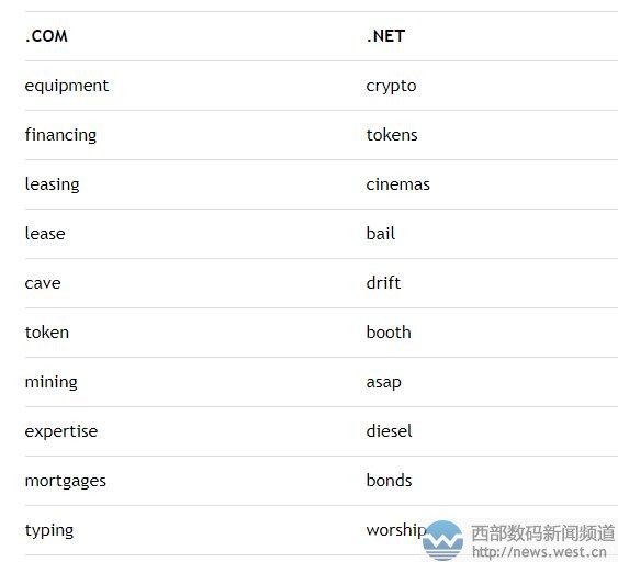 .com方面,“equipment”(設(shè)備,器材、配件)力壓眾多關(guān)鍵詞一舉成為最受歡迎的.com域名注冊詞匯。Equipment除了對應(yīng)有知名法國服飾品牌以外,本身還可以與多個行業(yè)多諸多詞語組合,可應(yīng)用的領(lǐng)域非常廣。 隨后是“financing”(融資、理財(cái)),作為一個金融類詞語,與此相關(guān)的域名可用來搭建投資理財(cái)?shù)冉K端平臺。同樣屬于金融行業(yè)詞的還有 “mortages”(抵押貸款),相關(guān)域名用來搭建抵押借貸平臺比較合適。 另外,兩個有著“租賃”之意的詞語“l(fā)easing”和“l(fā)ease”也成為6月份的注冊熱詞,可用于汽車、房產(chǎn)等多個行業(yè)租賃平臺。除此以外,“token”(代幣)、“mining”(采礦)、“cave”(洞穴)、“typing”(打字)均成為6月熱門注冊詞匯。 .net方面,兩個虛擬貨幣類詞語“crypto”(加密貨幣)、“token”(代幣)是6月最受歡迎的注冊詞匯。今年以來,虛擬貨幣行業(yè)的瘋狂發(fā)展,不僅使得相關(guān)域名成交價水漲船高,也催生了大批域名淵源不斷的被注冊。 隨后,“cinemas”(電影院)一詞在本月注冊量也極大,近年來,全球影視市場風(fēng)起云涌,不少大佬紛紛進(jìn)軍電影領(lǐng)域,加上今年大片不斷,“電影院”人氣高漲。 除此以外,“bail”(保釋金)、“drift”(漂泊)、“booth”(售貨棚)等詞也榜上有名。 本文轉(zhuǎn)載自新聞資訊,原文鏈接:威瑞信6月月報:虛擬貨幣熱度不減!“crypto”再成最受歡迎域名關(guān)鍵詞