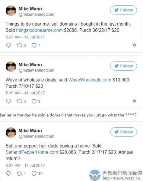 4天獲利500倍!論域名玩得溜,我只服Mike Mann三五互聯(lián)(35.com)7月14日消息,說真的,小編每次報(bào)道Mike Mann的交易消息時(shí),內(nèi)心都有止不住的羨慕嫉妒恨。尤其是今天這幾個(gè)域名的交易,小編真的有一種“老大爺?shù)沽硕疾环觥保ú灰?dāng)真),就服Mike Mann。