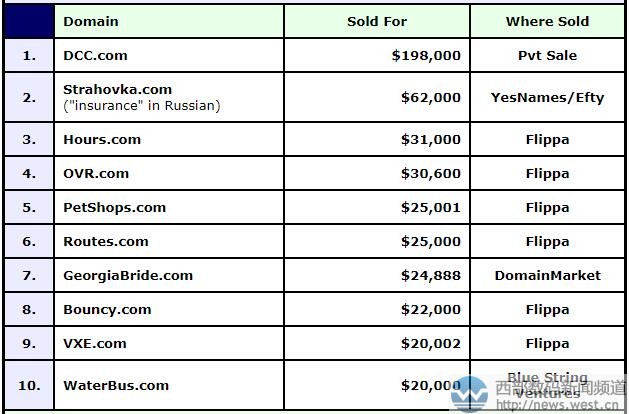 DN榜:三字母域名DCC.COM以134萬元奪冠!“保險”域名被終端拿下三五互聯(35.com)7月14日消息,本期的DN交易榜(7.3-7.9)上,高價成交的域名還不少,一掃往日夏季域名市場蕭條的狀態。本期奪得DN榜冠軍的是三字母域名DCC.COM,成交價為19.8萬美金,約合人民幣134萬元。 域名DCC.COM注冊于1997年9月,距今快20年歷史了。作為ABB型域名,DCC.COM品相出眾,簡短易記,而且又是三聲母域名,對應諸多豐富詞語,比如“多查查、調查處、冬蟲草、搭錯車、電磁場、大操場、電池廠”等,可廣泛用于醫療、科學、信息查詢、交通出行等領域,應用空間很大。據了解,域名DCC.COM是私下交易的,其高達134萬元的成交價讓其躋身目前為止今年成交價最高的20強域名之列。 排名第二的是域名Strahovka.com,成交價為62,000美元,約合人民幣42萬元。這個域名注冊于2005年5月,是俄語中“保險”的意思,特別適合搭建保險行業終端網站。據whois查詢,域名Strahovka.com已在7月7日轉移到了終端買家payoneer.com名下。 隨后是以31,000美元和30,600美元在Flippa平臺成交的域名hours.com和ovr.com,約合人民幣21萬元。前者是英語常用單詞,是“小時、時辰”的意思,可用來搭建服飾、美容、以及在線電商等終端網站,應用空間不錯。后者ovr.com則有“哦VR”的意思,適合用于虛擬現實領域。 本期榜單的第五名來自英文組合域名petshops.com,成交價為25,001美元,約合人民幣17萬元。該域名早在1996年就已注冊,其“寵物店、寵物商店”的含義清晰,指向明確,非常適合搭建寵物銷售網站或者寵物其他相關服務平臺。 另外,緊隨其后的域名routes.com也拍出25,0000美元價格,該域名是“路徑、路途”的意思,可搭建旅行相關平臺。其他域名,比如 “快活”Bouncy.com、vxe.com、“水上巴士”waterbus.com、“洋蔥”Onions.com、“打印、印刷”Print.net等也以不錯價格成交。 其他交易域名詳見下圖: