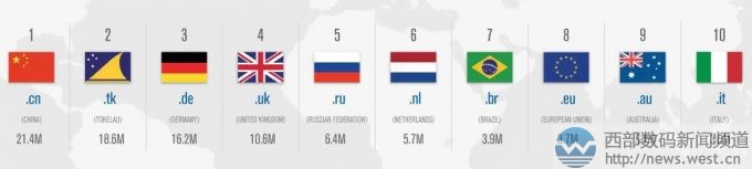 國(guó)別域名方面,截止到2017年第一季度末,注冊(cè)總量為1.431億個(gè),環(huán)比增長(zhǎng)03.%,同比增長(zhǎng)1.7%。其中,中國(guó)國(guó)家域名.cn注冊(cè)量突破2000萬(wàn),達(dá)到2140萬(wàn),是全球注冊(cè)量最大的國(guó)別域名。緊隨其后的是南太平洋島國(guó).tk域名,注冊(cè)量為1860萬(wàn)。接著是德國(guó)國(guó)家域名.de以及英國(guó)國(guó)家域名.uk。