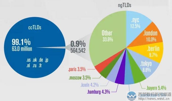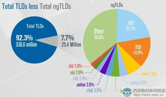 截至到今年3月31日,新頂級(jí)域名全球注冊(cè)量總量達(dá)2540萬(wàn),占全球域名注冊(cè)總量的7.7%。而排名前10的新頂級(jí)域名注冊(cè)量又占全球新頂級(jí)域名注冊(cè)總量的64.1%。其中,排名第一的是.xyz域名,占新頂級(jí)域名注冊(cè)總量的22.1%,隨后是.top域名,占全球新頂級(jí)域名注冊(cè)總量的14.9%,.loan域名、.wang域名以及.win域名分別次之。