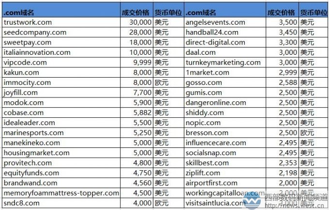 本期的.com域名中,五位數(shù)美元成交的域名只有4個(gè)。其中,排在第一的英文域名trustwork.com是“信任工作”的意思,由于沒有特殊的行業(yè)趨向性,適合多個(gè)領(lǐng)域建站使用。搜索發(fā)現(xiàn),目前有新西蘭云管理軟件trustworks.co.nz、全球性環(huán)保企業(yè)trustworksglobal等與之對應(yīng)。 排名第二的是以28,000美元結(jié)拍的英文組合域名seedcompany.com,約合人民幣19萬元。該域名注冊于1998年,距今已有19年歷史,直譯為“種子公司”,對應(yīng)有服飾品牌Seed Heritage、機(jī)動(dòng)戰(zhàn)士高達(dá)SEED動(dòng)畫以及一款名為seed的社交閱讀應(yīng)用。總的說來,因?yàn)椤皊eed”和“company”都是非常通用的詞,可應(yīng)用的空間也比較大。 隨后是域名sweetpay.com,成交價(jià)為18,000美元,約合人民幣12萬元。該域名的主體有單詞“pay”是“支付”的意思,所以域名sweetpay.com可以視作一個(gè)支付類域名,直譯為“甜蜜付”。同樣五位數(shù)美元成交的域名還有italiannovation.com,價(jià)格為10,000美元。該域名雖然字符較長,不過含義清晰,有“意大利創(chuàng)新”之意。