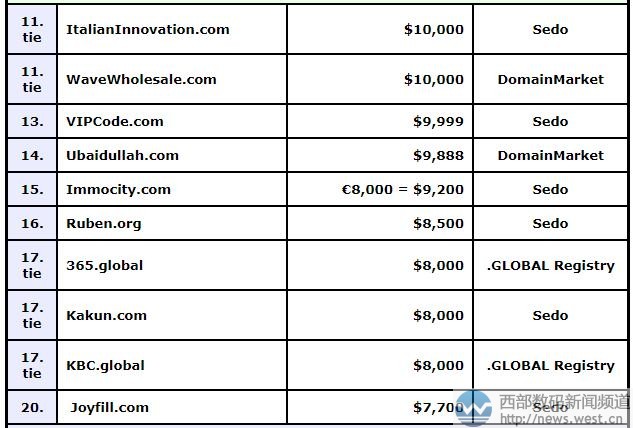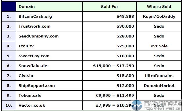 據whois信息顯示,域名bitcoincash.org于今年3月份手工注冊,雖然注冊時間很短,但由于其“比特幣現金”的含義迎合了今年上半年高歌猛進的虛擬貨幣尤其是比特幣的發展,所以這類域名的市場價值隨著水漲船高,bitcoincash.org能賣出33萬元的價格也是情理之中。 隨后是以30,000美元在sedo平臺成交的域名trustwork.com,約合人民幣20萬元,有“信任工作”的意思。目前對應新西蘭云管理軟件trustworks.co.nz、全球性環保企業trustworksglobal等。而購買域名trustwork.com的是一家新興科技發展企業Trustwork。 緊隨其后的是以28,000美元結拍的英文組合域名seedcompany.com,約合人民幣19萬元。該域名直譯為“種子公司”,對應有服飾品牌Seed Heritage、機動戰士高達SEED動畫以及一款名為seed的社交閱讀應用。該域名盡管目前尚未啟用,不過whois顯示已經綁定至服務器了,不久將建站上線。 本期榜單的第五名則是私下成交的icon.tv,成交價為25,000美元,約合人民幣16.9萬元。Icon是“偶像、崇拜”的意思,.tv原是太平洋島國圖瓦盧的國家域名,后多用在視頻、直播類領域。組合在一起,域名icon.tv很適合搭建偶像直播平臺。 本期榜單排名前10的域名中,國別域名還有德國域名snowflake.de(雪花),成交價為15,000美元,約合人民幣11.5萬元;英屬印度洋領地域名give.io(給予),成交價為15,800美元,約合人民幣10萬元;以及英國國家域名vector.co.uk(矢量、航向)也以五位數美元成交。 除此以外,本期一枚新頂級域名token.sale也以11,499美元的價格躋身前10,約合人民幣8萬元。token.sale有“代幣銷售”的意思,很適合搭建虛擬貨幣電商類平臺。另外,其他域名也有不錯表現,交易詳見下圖: 本文轉載自新聞資訊,原文鏈接:DN榜:比特幣風頭太盛!3月注冊的域名bitcoincash.org賣出 6位數!