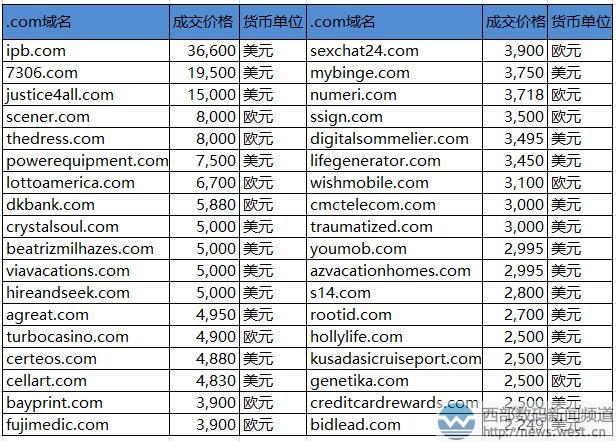 本期的.com域名中,五位數(shù)美元成交的域名只有5個(gè)。其中,排在第一的域名ipb.com早在7月底就曝出交易消息。該域名注冊(cè)于1995年9月,首字母“i”諧音“愛”,而字母“pb”對(duì)應(yīng)有“跑步、排版、泡吧、聘寶、陪伴”等含義。所以組合在一起,域名ipb.com可廣泛用于跑步軟件、婚戀交友、娛樂休閑、以及招聘等諸多行業(yè)。 排名第二的是以19,500美元成交的數(shù)字域名7306.com,約合人民幣13萬元。該域名注冊(cè)于2004年,雖然含有數(shù)字0,但字符簡(jiǎn)短好記,建站不受限制,可用來搭建金融、游戲、門戶網(wǎng)站等。 緊隨其后的是一枚組合域名justice4all.com,成交價(jià)為15,000美元,約合人民幣10萬元。該域名中的數(shù)字4英文發(fā)音與單詞“for”相同,所以justice4all.com也就是“對(duì)所有人公正”的意思。適合搭建公益網(wǎng)站或者法律援助平臺(tái)。