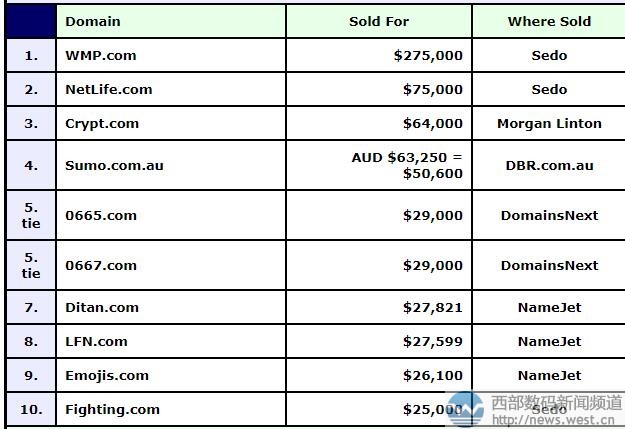 域名WMP.COM注冊于2003年7月,距今14年歷史,對應有中文里的“完美屏、微名片、我買票、外賣品”等含義,適合搭建票務、外賣等平臺。除此以外,WMP對應微軟媒體播放器Windows Media Player的首字母縮寫,所以微軟也是域名wmp.com的潛在終端。三聲母域名可挖掘的含義十分豐富,可與眾多終端匹配,市場價值頗高。 排名第二的英文域名netlife.com,成交價為75,000美元,約合人民幣49萬元。這個域名早在1996年就已注冊,距今已超20年歷史了,由英文單詞“Net(球網)”和“Life(生活)”構成,簡單好記,適合搭建生活創意類平臺。據查詢發現,相關域名NetLife.hu/.ec/.vn均已啟用建站了,由此可見應用價值相當不錯。 隨后是以64,000美元成交的域名crypt.com(約合人民幣42萬元),該域名有“地窖”、“加密字符”的意思,尤其是“加密”一詞,對應當前火熱的虛擬貨幣領域,很適合搭建加密貨幣交易、資訊平臺。 接著一枚長尾域名sumo.com.au也拍出了50,600美元的價格,約合人民幣33萬元。Sumo是“相撲”的意思,適合搭建相撲相關平臺。除此以外,也有不少終端以sumo命名,比如網站工具sumo,就啟用了相關域名sumo.com;另外一款交通仿真軟件也以sumo命名。 除了英文域名,兩個數字域名0655.com和0667.com均以29,000美元上榜,約合人民幣19萬元。數字域名簡單易記,加上建站不受限制,可廣泛用于游戲、金融、網址導航以及門戶類網站,應用空間比較廣泛。 除此以外,其他域名也有不少表現,像雙拼域名ditan.com、三字母域名LFN.com等成交價也不低,交易詳見下圖: