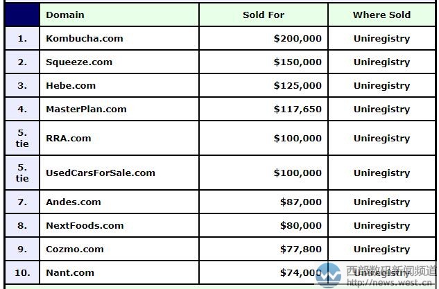 DN榜:印尼“康普茶”竟賣出132萬元! 多個英文域名六位數美金成交!三五互聯(35.com)9月21日消息,最新一期的DN榜(9.11-9.17)被Uniregistry平臺此前交易但未公布價格的域名占據。其中,賣價最高的是一枚印尼語域名kombucha.com,成交價為200,000美元,約合人民幣132萬元。