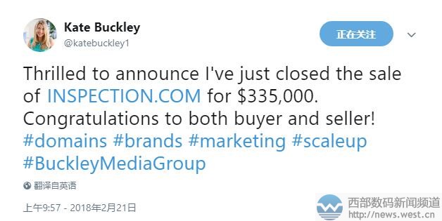 花212萬元升級域名!亞洲質檢收購Inspection.com2月22日消息,昨天早上域名銷售公司Buckley MediaGroup CEO在推特上曝料稱,域名Inspection.com以335,000美元達成交易,約合人民幣212萬元。經查詢發現,該域名背后買家乃是亞檢質量檢測有限公司Asia Inspection。
