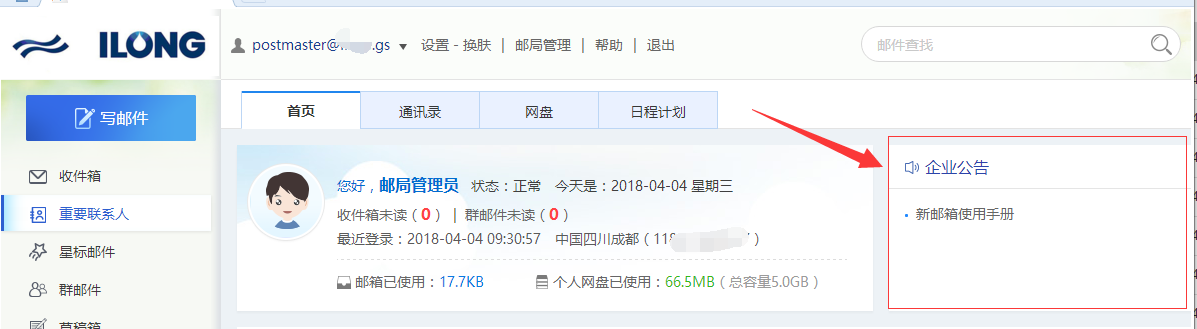 1、登錄到企業郵局點擊“郵局管理”,