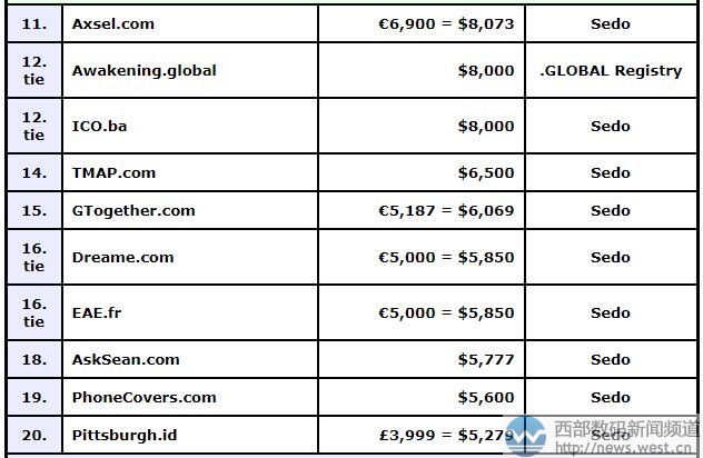 域名inception.com注冊于2002年7月,已通過Bestweb平臺完成交易,成交價為550,000美元,折合人民幣366萬元。該域名是英文“開始,開端,初期”的意思,是比較常用的英文詞匯,由于沒有特定的行業傾向性,適合多個領域建站使用。目前,與之對應的有電影《盜夢空間》(inception)和網絡模型Inception。 隨后是剛在sedo交易榜上位居首位的域名NBX.COM,成交價折合人民幣為87萬元。這個三聲母域名注冊于1995年,可挖掘的含義較大,不過比較引人注目的還是其含有“牛逼、牛幣”的意思,前者是網絡熱詞,后者更是對應當前火熱的虛擬貨幣領域,其市場價值也就不言而喻了。 接著是兩枚四字母域名ezra.com和sekt.com,成交價分別為25,000歐元和22,500歐元。前者在英文中是人名“埃茲拉”的意思,與之對應的終端有斯拉控股集團(Ezra Holdings),其官網啟用域名ezraholdings.com;后者對應有德國葡萄酒里的“塞克特”起泡酒,作為酒類詞匯,“sekt”在行業內較為通用,適合搭建相關起泡酒網站平臺。另外,以19,999美元成交的betiq.com也值得關注,折合人民幣超13萬元。 除此以外,本期DN榜上兩枚國別域名躋身前10,分別是德國域名feel-the-flow.de和歐盟域名mine.eu,成交價分別為12,500歐元和9,157歐元。其中,feel-the-flow.de直譯為“感受氣流”;域名mine.eu主體是非常通用的英文單詞,有“礦井、地雷、我的”等意思。 其他域名交易情況,詳見榜單: