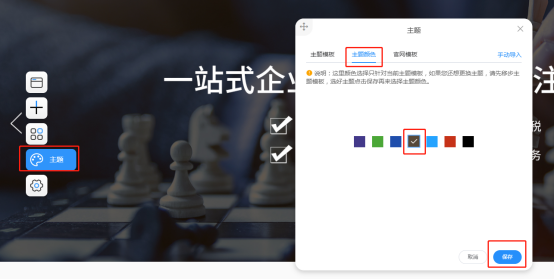 (2)切換至主題顏色選項(xiàng)卡,點(diǎn)擊該主題提供的顏色搭配,可更換網(wǎng)站主題顏色(不同主題支持的主題色不同)