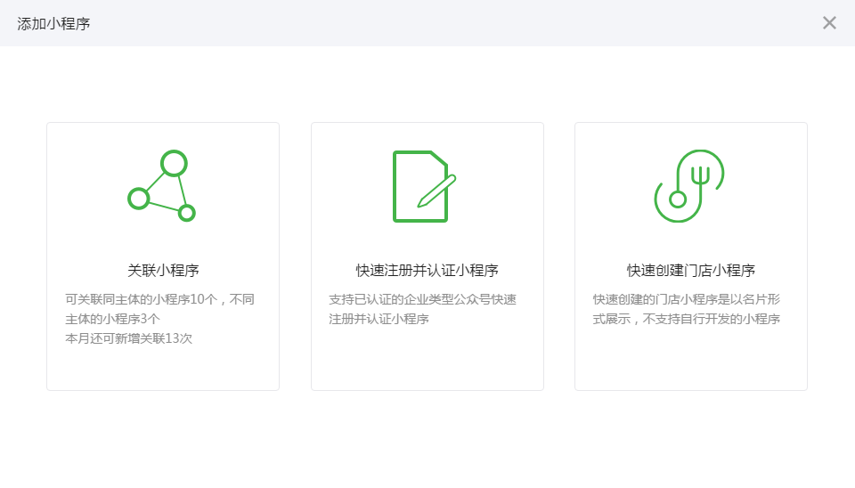 公眾號一個月可新增關聯小程序13次,小程序一個月可新增關聯5次。