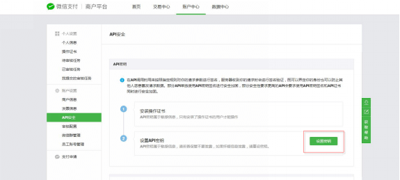 3.2.2 商家密鑰點擊“賬戶中心”->“API安全”菜單,設置32位密鑰并記錄備份,如下圖示; 注意:密鑰填寫錯誤會導致支付異常,如期間修改請重新登錄商城后臺同步修改參數(shù)。