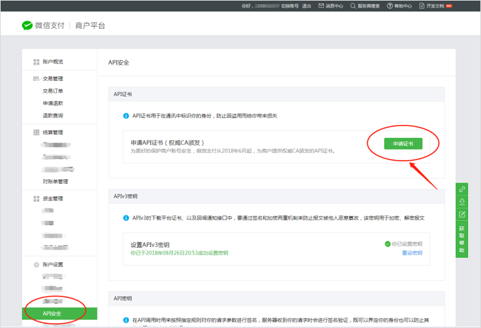 3.2.3 獲取API證書注意:請務必按照操作流程去下載證書,期間請不要關閉工具等相關程序,如生成了證書關閉工具的話,會導致證書無法下載,只能等48小時之后重新生成。(證書一年只能生成3次,下載后請保存好) 一、如何判定證書類型為【權威CA頒發(fā)的API證書】登錄微信支付商戶平臺點擊APT安全,出現(xiàn)如下圖所示則為權威CA頒發(fā)的API證書