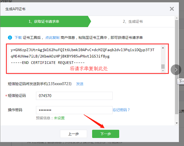 6、在證書工具里復制的證書串點后返回【微信支付商戶平臺】,將復制的證書請求串粘貼至生成aid證書的頁面,并輸入短信驗證碼及操作密碼,點擊下一步