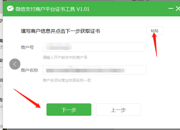 4、復制好商戶號和商戶名稱點擊切換至【證書工具】,點擊右上角的【粘帖】按鈕,將先前復制的商戶號和商戶名稱粘帖到證書工具中,然后點擊【下一步】