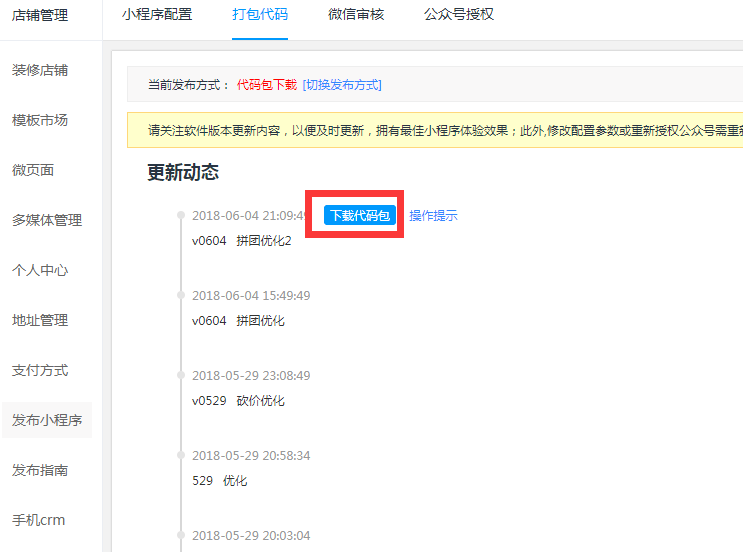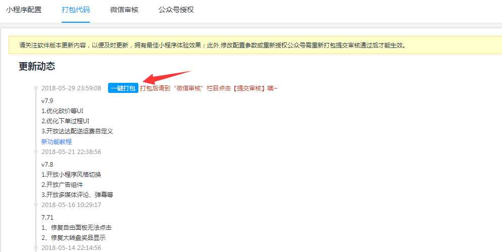1.3在線更新打包授權綁定小程序后,在“打包代碼”頁面點擊【一鍵打包】按鈕打包小程序; 提示:請時刻留意該頁面版本更新情況,及時更新最新軟件版本,達到最佳體驗效果。