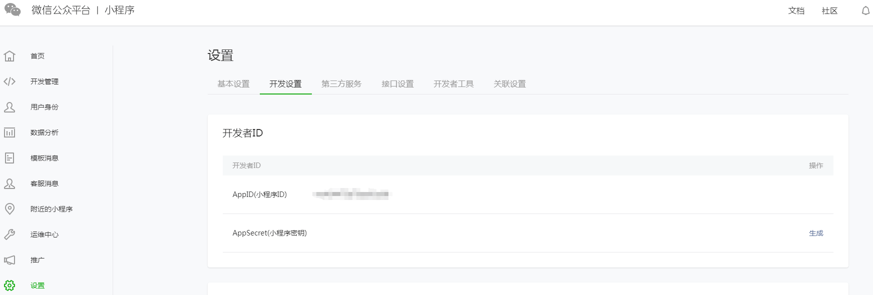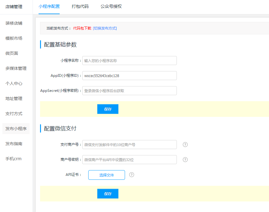 2.代碼下載代碼包下載是在平臺上下載小程序代碼包,自行通過微信開發(fā)者工具上傳代碼并通過微信公眾平臺完成小程序審核、小程序發(fā)布操作,適合對微信小程序較熟悉的用戶。 2.1配置小程序參數(shù)登錄管理后臺,點擊【店鋪】菜單->點擊【發(fā)布小程序】->點擊【小程序配置】,配置小程序的參數(shù):小程序名稱、AppID、AppSecret,AppID與AppSecret可登錄微信小程序后臺——設置——開發(fā)設置中獲取;