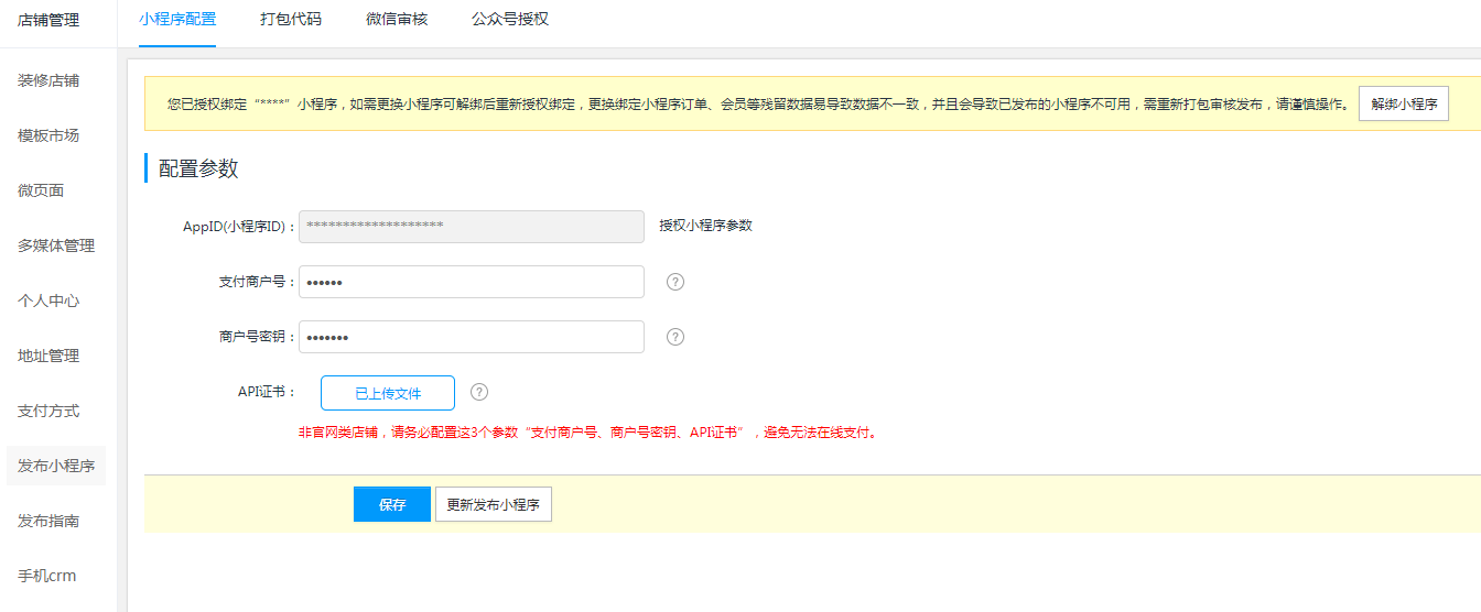 1.2支付參數(shù)配置(不涉及線上支付可跳轉本章節(jié))小程序商城等涉及在線支付,授權綁定小程序后,進入小程序配置頁面,輸入微信支付商戶號、商戶密鑰、上傳微信支付API證書(各參數(shù)獲取方式上一章節(jié)已說明);