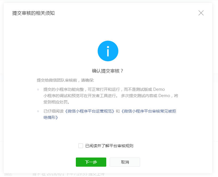 三、注意事項1.在線上傳與代碼包下載兩種小程序發(fā)布方式,同一時間只能使用其中一種。如果小程序已經(jīng)發(fā)布,隨意切換小程序發(fā)布方式會導致已發(fā)布的小程序無法正常訪問,必須重新提交審核通過后才能恢復訪問。2.代碼包下載的方式,將無法在本平臺對小程序進行預覽、提交審核以及發(fā)布小程序3.小程序提交審核前,請認真閱讀《微信小程序平臺運營規(guī)范》和《微信小程序平臺常見拒絕情形》并仔細檢查小程序內(nèi)容,提高小程序審核通過的概率。