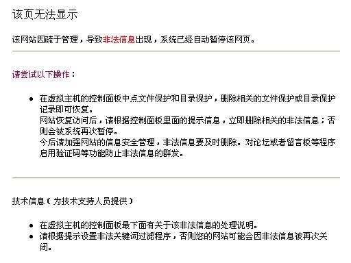 B:如果是被系統(tǒng)自動(dòng)監(jiān)控并進(jìn)行鎖定的網(wǎng)站,用戶可以登錄虛擬主機(jī)控制面板,根據(jù)最下方的提示,查明具體的非法信息內(nèi)容。根據(jù)提示刪除目錄保護(hù)或文件保護(hù)即可恢復(fù),恢復(fù)后請(qǐng)立即刪除相關(guān)的非法內(nèi)容,否則會(huì)被系統(tǒng)再次鎖定!