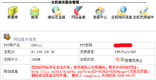 6、站點(diǎn)因空間、流量等資源超標(biāo)或放置違法違規(guī)內(nèi)容,被管理員停止;