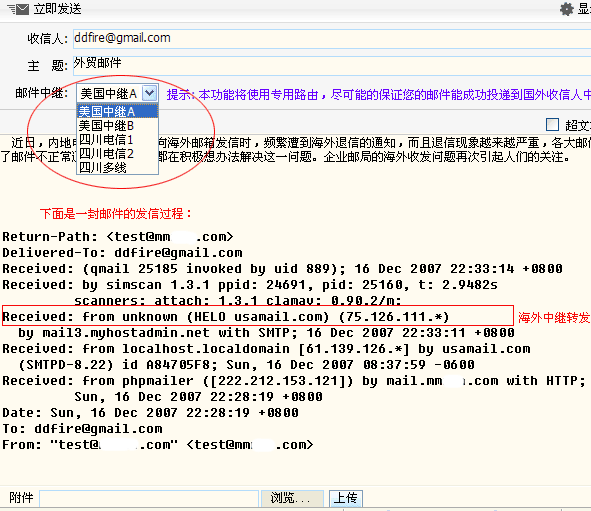 發往海外(國外)郵件失敗的解決辦法?目前由于種種等原因,中國和國外的郵件通信一片慘像,海外郵件收發出現退信或丟失可以說是家常便飯。 表現情況一般是:發往海外的郵件出現退信,提示: Remote host said: 553 61.139.126.* rejected due to spam, contact 480-505-8877 pawel_konopa@wp.pl: 出現這些的情況,主要有以下幾個原因: 1)被國外的部分運營商拒收。國內IP被列入黑名單、國內大多數郵局不支持反解析等原因使國內郵件被國外很多郵局拒收等; 解決的辦法是:在我司郵件系統里面,點發郵件>再點“發送國外郵件”,通過這個功能可以選擇美國中繼服務器直接發到海外信箱,以解決國內IP被列入黑名單的問題。發送國外郵件 暫存在草稿箱 顯示增強功能