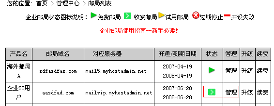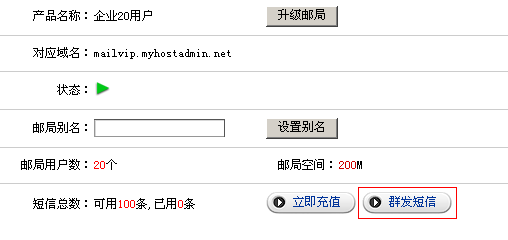 2) 再次確認您要購買的短信產(chǎn)品型號,并點擊"進入下一步" 按鈕; 3) 在購買頁面中輸入您公司的詳細信息; 4) 短信開通定單已經(jīng)添加進您的定單中, 5) 進入管理中心->;業(yè)務(wù)管理->;郵件管理,選擇我們?yōu)槟_通短信服務(wù)器的郵局,點擊管理,進入;