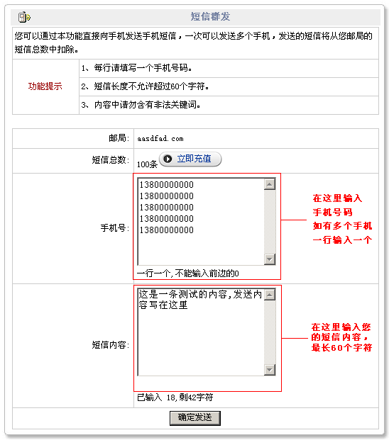 6. 企業(yè)短信快速發(fā)送: 可以登錄 http://www.myhostadmin.net ,選擇“郵件管理”,輸入域名和密碼登錄后即可直接群發(fā)短信,不用登錄三五互聯(lián)網(wǎng)站也可以發(fā)送! 7.我司為了方便用戶使用發(fā)布了短信群發(fā)工具,下載地址2012-2-7更新:http://m.shinetop.cn/services/sms/sendsms.rar 8.開發(fā)說明文檔及示例下載地址(.net,php,asp) 2012-2-1更新 :http://m.shinetop.cn/services/sms/west263sms_demo.rar