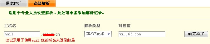 [原創]怎樣設置網易域名郵箱解析最近網易推出了域名郵箱 http://ym.163.com/ ,最大可創建200個同域名的帳號, 非常受歡迎,但是解析卻遇到了困難在此講解下解析方法。 開通網易域名郵箱以后會看到如下的解析說明: 以下截圖是域名在我司的解析方法: 首先點“DNS解析管理”--“高級解析”,主機名填寫“mail”,解析類型選擇“CNAME記錄”,對應值填寫“ym.163.com”這點在增加網易域名郵箱那并無說明,增加的目的是可以用mail.yourname.com來訪問,意思就是用mail.您的域名,來登陸郵局。