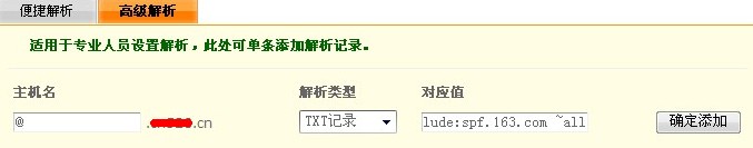 這里的主機名依然寫@,對應值寫網易提供的“v=spf1 include:spf.163.com ~all ”不包含雙引號。然后點添加。