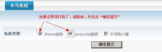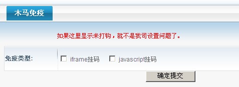 4、在木馬免疫中,取消“iframe掛馬”和“JavaScript掛馬”的勾,然后點(diǎn)“確定提交”重新登錄shopex后臺(tái),一般就能可視化編輯了。