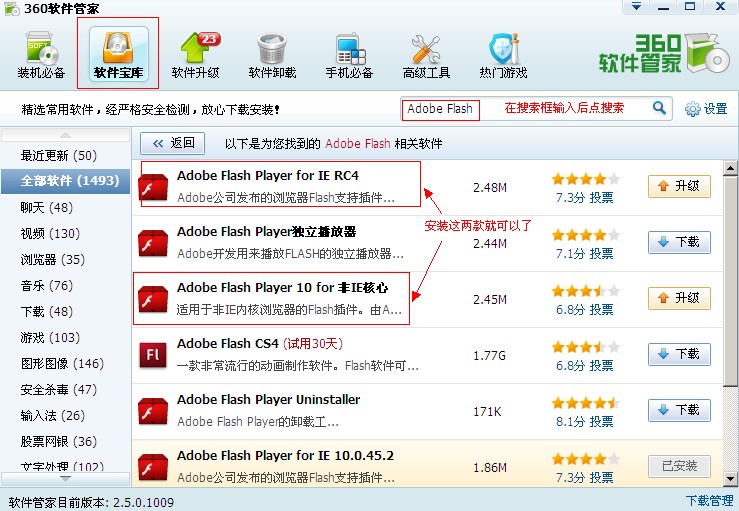 打開360安全衛(wèi)士,點(diǎn)擊“軟件管家”,然后點(diǎn)擊“軟件寶庫”,搜索Adobe Flash,然后按照以下圖示,選擇安裝,安裝好以后,重新打開瀏覽器就可以正常使用了。