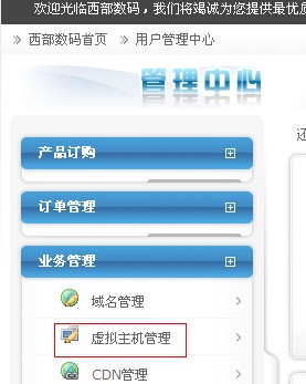 1、首先登陸我司網站m.shinetop.cn,輸入會員賬號和密碼,在管理中心左側點擊“業務管理”—“虛擬主機管理”如圖: