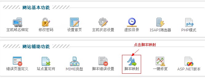 3、進入虛擬主機管理面板,(也可以通過www.myhostadmin.net選擇“虛擬主機”直接登錄到虛擬主機管理面板)。在虛擬主機管理面板點擊“腳本映射”,如圖: