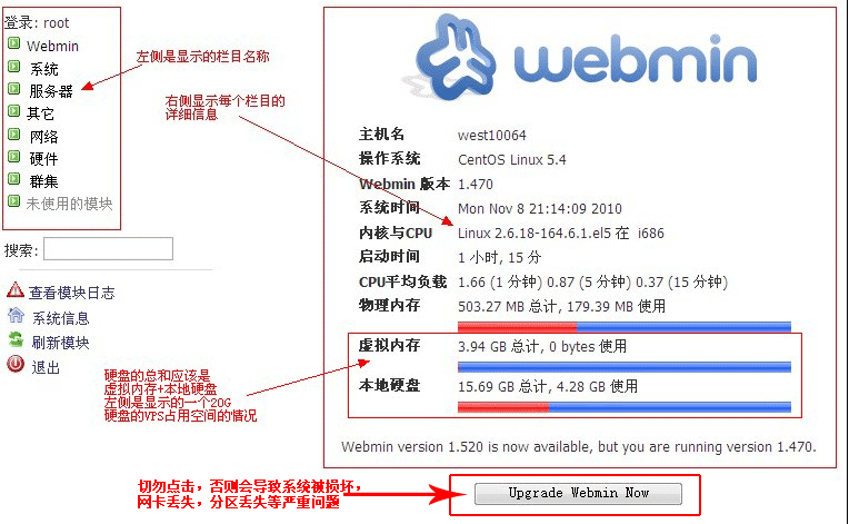 "Upgade Webmin Now" 升級功能一般不推薦使用,特別是這里面的升級內核的功能,切勿點擊,否則會導致系統被損壞,網卡丟失,分區丟失等嚴重問題。