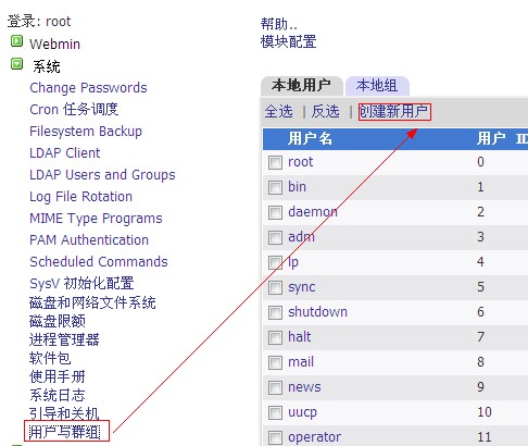 4、接下來開始建立用戶: a、 首先建立用戶,點擊左側的“系統”—“用戶與群組”,然后點擊右側的“創建新用戶”如圖: