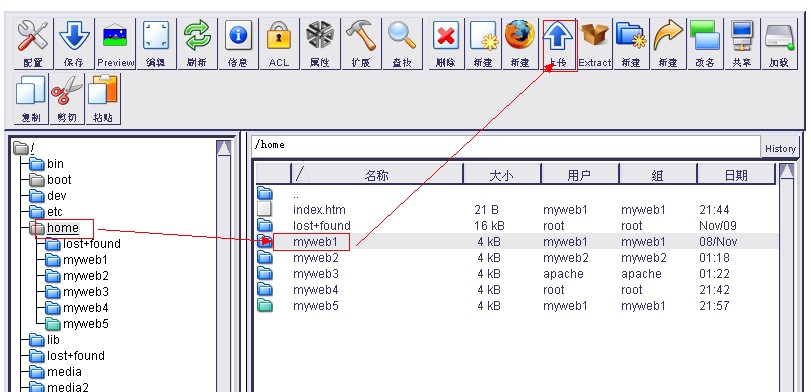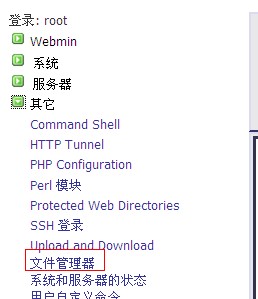 webmin文件管理器功能詳解webmin里的文件管理器有著強大的功能,為了方便不熟悉linux命令的用戶操作linux,在此對文件 管理器做一個詳細的介紹。 文件管理器功能需要java虛擬機支持,若您的webmin無法顯示,請下載微軟的java虛擬機,下載地址:http://www.java.com/zh_CN/download/windows_ie.jsp?locale=zh_CN 一、webmin文件管理器圖標介紹: 1、 2、 方便備份。 3、 4、 5、 6、 的子目錄。 7、 8、 9、 10、 11、 12、 13、 14、 包。 15、 16、 17、 18、 19、 20、 21、 22、 23、 二、 使用webmin上傳壓縮包并解壓,請確定您的壓縮包是zip或者tar或者tar.gz格式。1、點擊左側的“其他”--“文件管理器”,如圖: 2、選擇您需要上傳的文件夾位置,點擊上傳按鈕,如圖:
