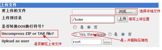 3、選擇您需要上傳的文件,若是壓縮包,可以選擇解壓功能。因為webmin采用root賬戶管理,所以默認顯示上傳用戶是root。 如圖: 上傳后您可以在文件夾看到上傳的文件,若是壓縮包,上傳后可以直接看到解壓后的文件,如果位置不對可以用剪切功能調整 位置。