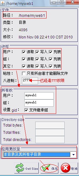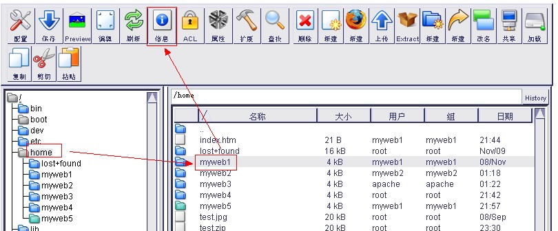 四、為文件或文件夾附加權限。 1、登錄webmin,點擊“其他”--“文件管理器”,選擇對應的文件或文件夾,然后點擊信息按鈕。如圖: 2、在信息窗口中,查看路徑是否正確,別將權限附加到其他位置,然后在許可中設置用戶、組、其他的權限,在所有權中設置 用戶和組名,應用更改至,一般選擇“本目錄及其所有子目錄”,這樣可以附加權限和所有者到每一個文件。如圖: