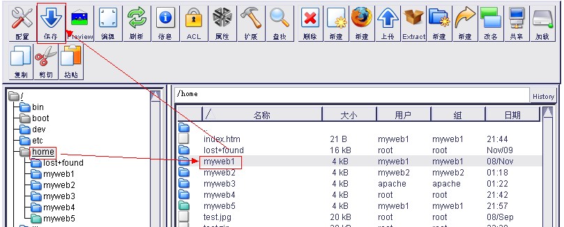 五、壓縮備份數據 1、登錄webmin,點擊“其他”--“文件管理器”,選擇對應的文件或文件夾,然后點擊保存按鈕。如圖: