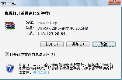 3、選擇文件格式后,頁面上會進入假死狀態,實際上是服務器端在壓縮文件,不要做其他的操作,壓縮完成后 會彈出下載提示框,點擊保存即可下載到本地。如圖: 以上就是一些常用到的功能說明,太大的文件上傳,建議使用FTP,上傳后采用文件管理器的解壓功能進行解壓,然后設置權限, 并移動到正確的路徑下。