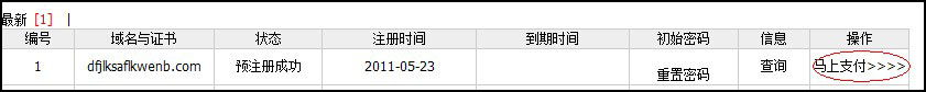 設置完成后即可開始注冊域名了,注冊域名前請確認在我司的賬戶下有足夠的款項,否則點擊“馬上付款”將會報錯。 注冊域名時,先查詢是否能注冊,能注冊的域名,填寫好個人資料,點擊“到下一步”, 系統會提示“預注冊成功,馬上付費>>>”,點擊后系統會轉到域名管理列表,您剛注冊的域名會提示“預注冊成功”,點擊最右側的“馬上支付>>>>” 就正式注冊成功了,如圖: