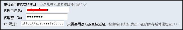 “系統參數”里的設置內容很多,可以根據您自己的需要來選擇設置,設置域名接口的時候,先找到“域名接口部分”——“兼容新網的API的接口” 這里要求輸入代理用戶名、代理密碼以及API網址。代理用戶名和密碼參見說明文檔開頭設置的密碼。API網址填寫:http://api.west263.com。如圖: