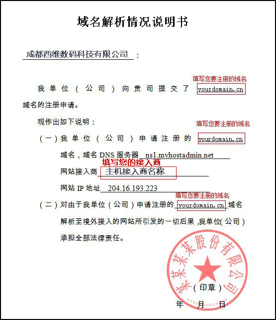 填寫時,僅需要將“yourdomain.cn”替換為您需要注冊的域名即可,其他地方不做修改,印章處需加蓋公司公章,如果是個人用戶注冊,在印章處簽名即可,日期填寫申請注冊時的日期。填寫后將文檔在管理中心上傳即可(不再發到郵箱trans@west263.com) 。 申請后需要cnnic處理,一般需要3~5個工作日開通。 文檔下載地址:http://downinfo.myhostadmin.net/domainresolution.doc