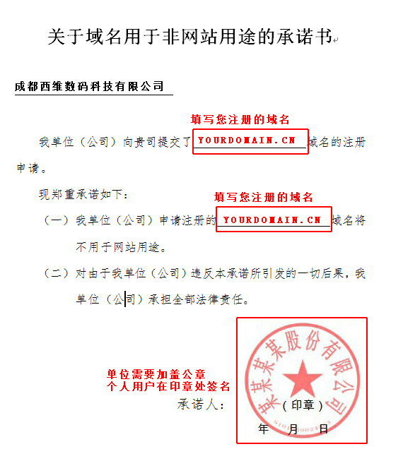 <<關于域名用于非網站用途的承諾書>> 應上級主管單位要求,域名用于非網站用途 , 例如郵局等,對應的域名不需進行網站ICP備案掃描驗證,也就是說如果您注冊 .cn域名,不用于網站訪問,是可以不用備案的。但須填寫《域名用于非網站用途的承諾書》,填寫示例如下圖: